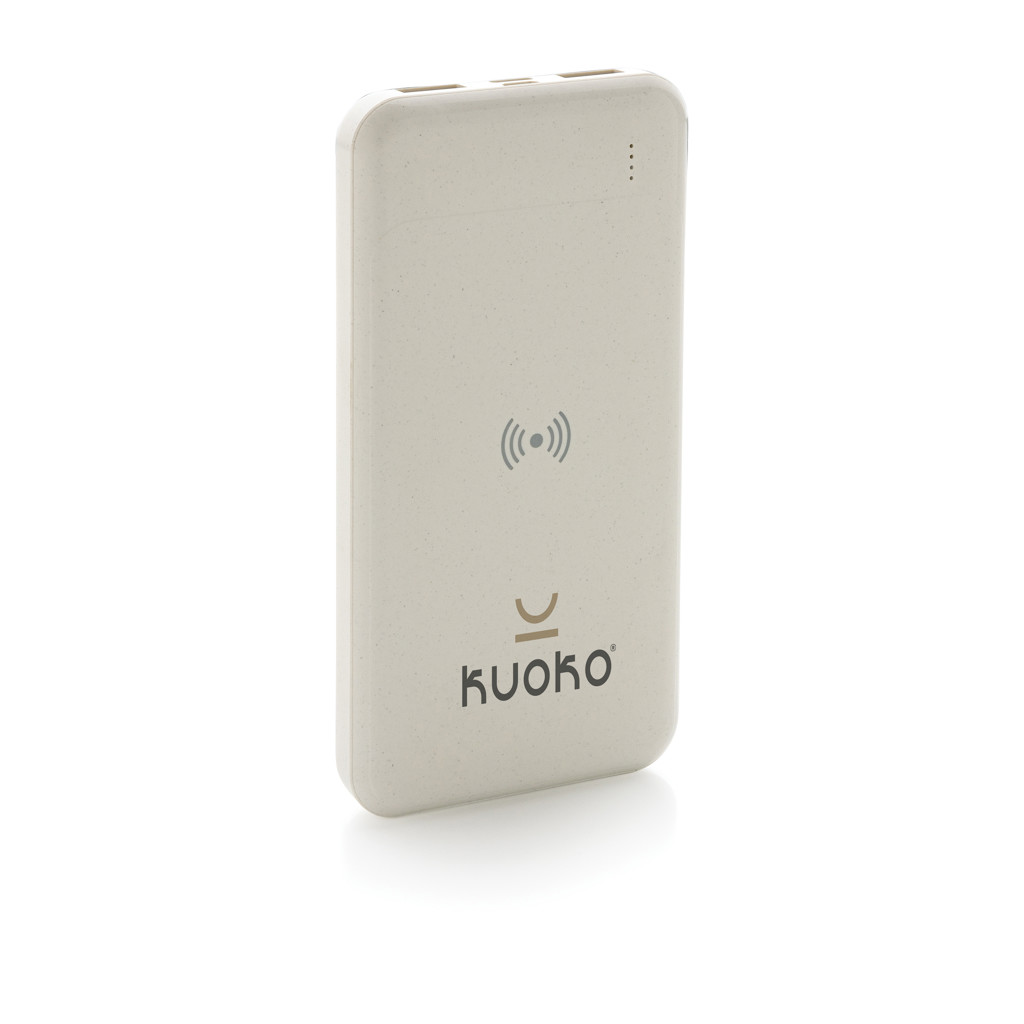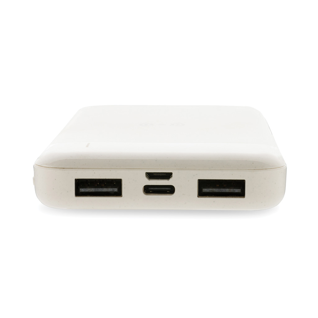 8.000 mAh powerbank with 5W wireless charger where the case is made out of RCS certified recycled ABS plastic. RCS (Recycled Claim Standard) is a standard to verify the recycled content of a product throughout the whole supply chain. Total recycled content: 22% based on total item weight. When fully charged the powerbank provides you with enough energy to re-charge your mobile phone up to four times. The powerbank contains a long lasting grade A 8.000 mAh lithium polymer battery. The power indicators will indicate the remaining energy level so you always know when to re-charge. Type-C input 5V/2A; Micro USB Input 5V/2A; Wireless Output 5W; 2x USB output 5V/2A; Item and accessories PVC free. Including PVC free recycled TPE material charging cable.