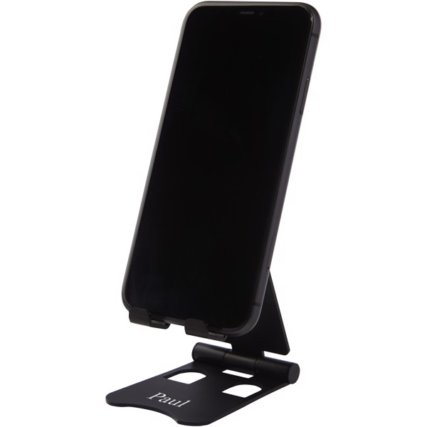 Foldable phone stand made of aluminium. Both the height and viewing angle can be adjusted, making this the perfect accessory for conference calls, broadcasts, live streaming, or simply to watch a movie. The bottom has anti-slip material to prevent it from moving. Delivered in a premium kraft paper box with a colourful sticker.