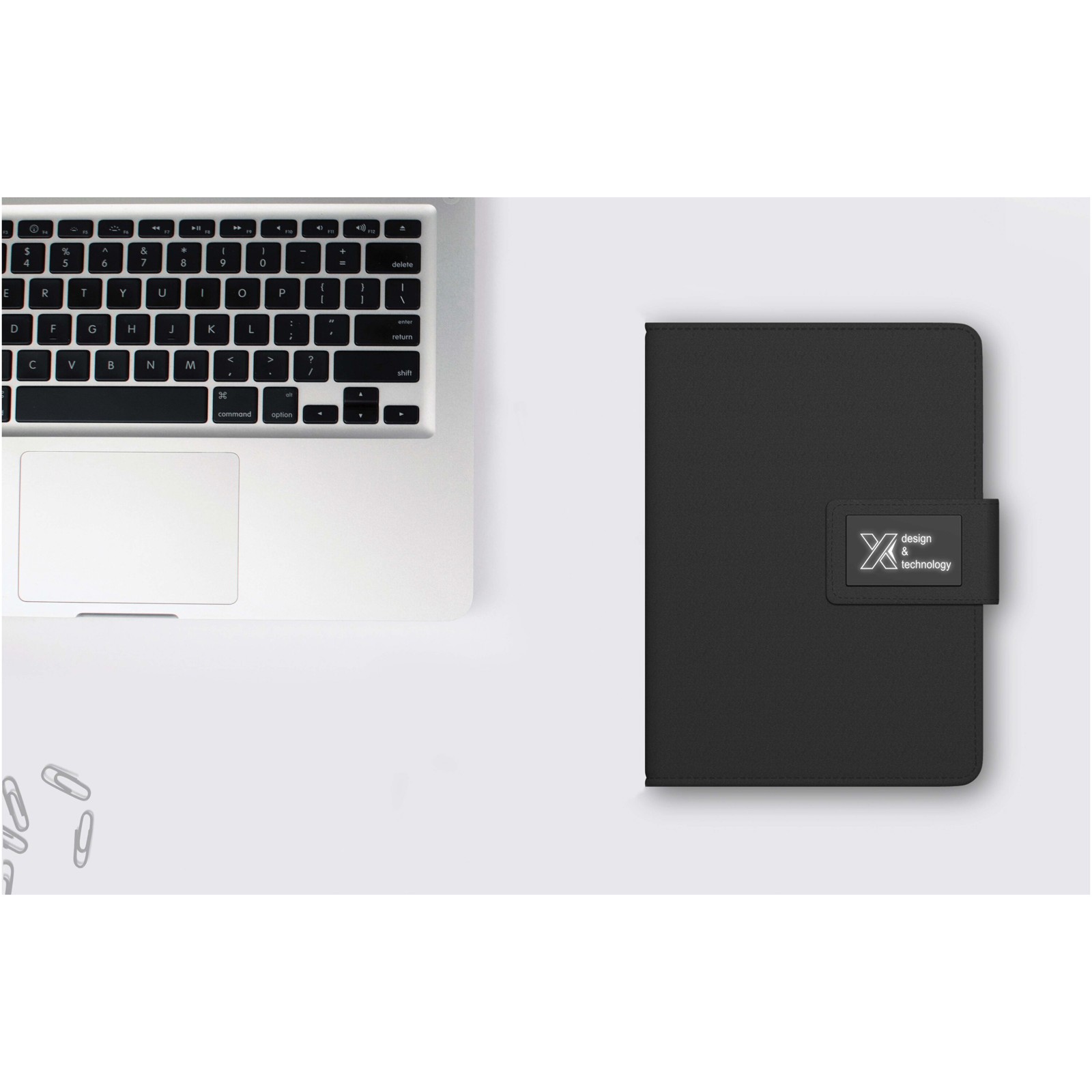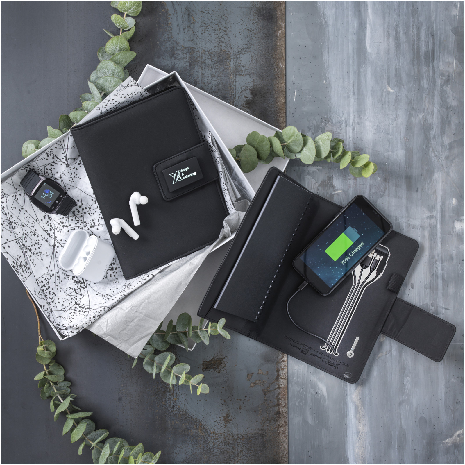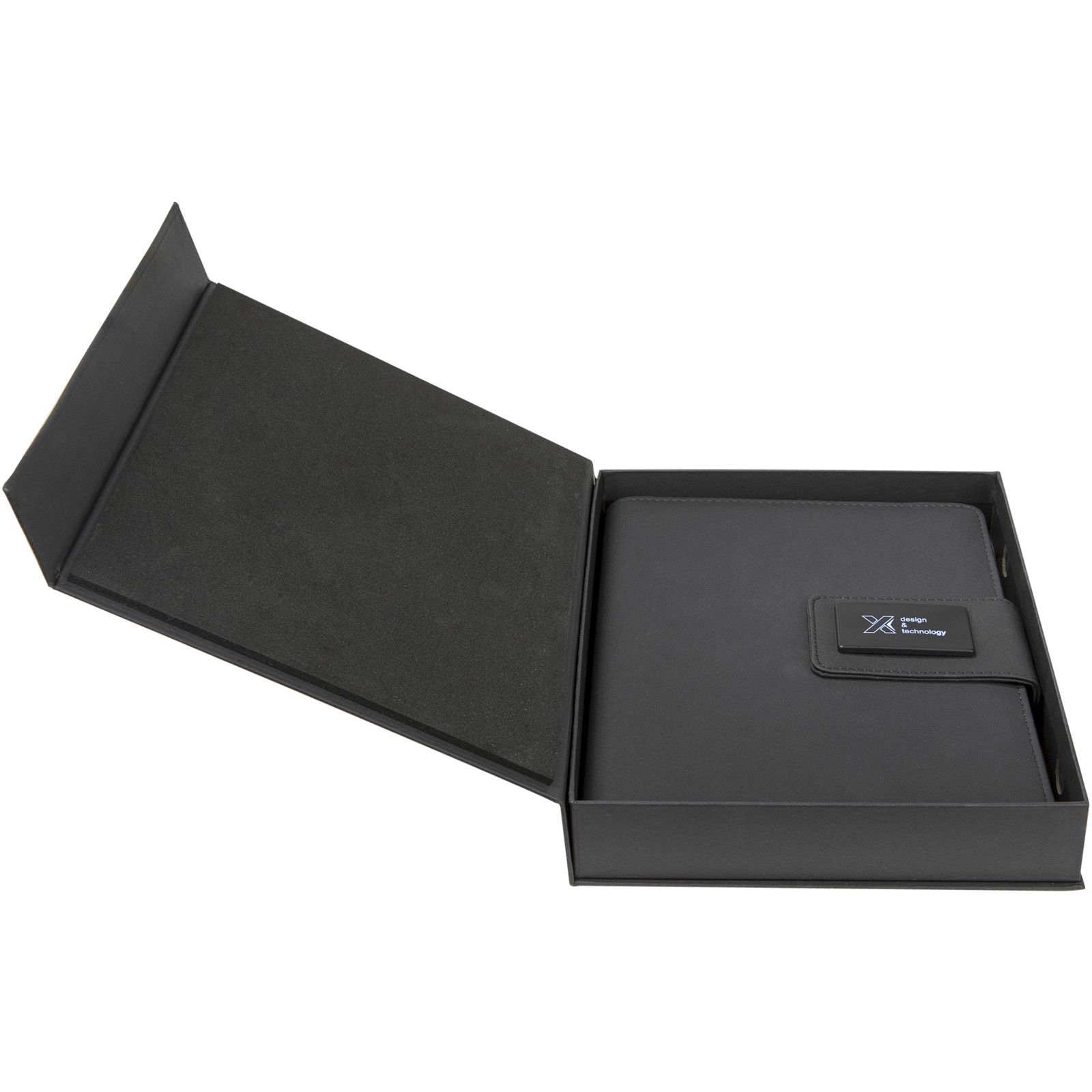 Light-up logo notebook with a 4000 mAh power bank with a 3-in-1 integrated cable (Type-C, Android, iPhone). Input: 5V/1A. Output: 5V/2A. When opened, the magnetic strap lights up. This functionality works for up to 25 days without recharging the device! The removable A5 notebook comes with 30 pages of recycled and biodegradable paper. Delivered with a gift box with magnetic closure, made out of recycled paper.