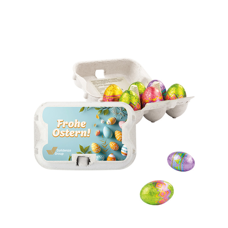 Lindt chocolate Easter eggs in an egg box with a paper label, individually printed. Content: 6 Lindt mini-eggs, milk hazelnu, 50 g. Seasonal article - while stocks last!