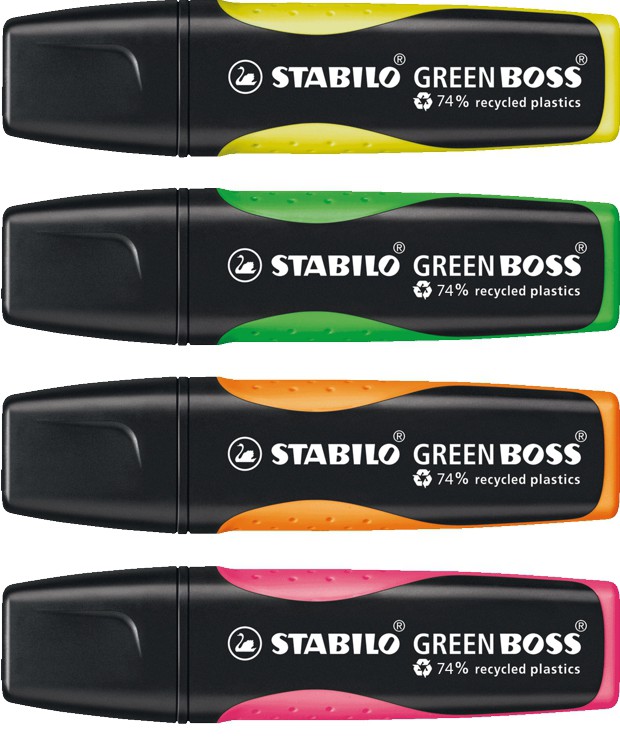 A GLOWING GREEN CONSCIENCE. Highlighter made of 74% recycled plastics; classic STABILO BOSS shape with soft ergonomic grip zone. 2 line widths, refillable ink. With anti-dry-out technology: 4 hours of protection from drying-out. Also available now in 4 trendy pastel shades.