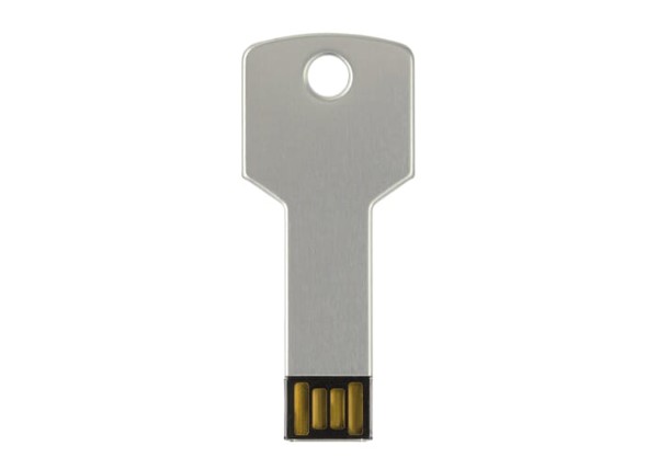 USB flash drive with 8GB memory, in the shape of a key. Aluminium material. Comes packaged in a white gift box.