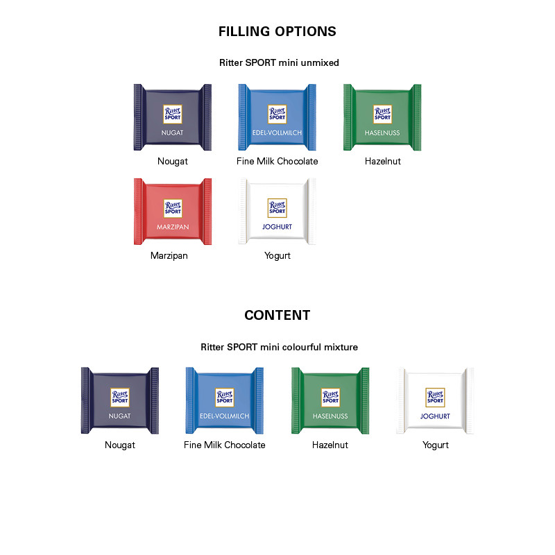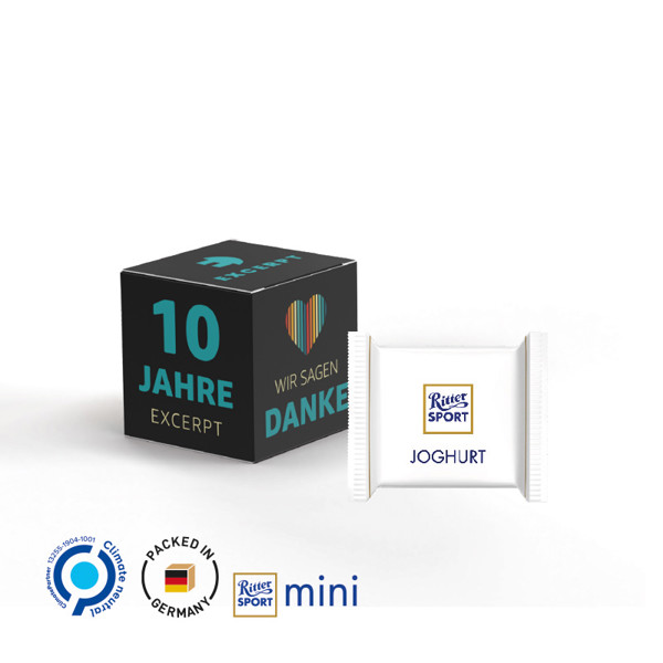 Promotional packaging in form of a cube, made of white cardboard, individually printed. Content: Ritter SPORT mini yoghurt (single flavour only), 66 g.