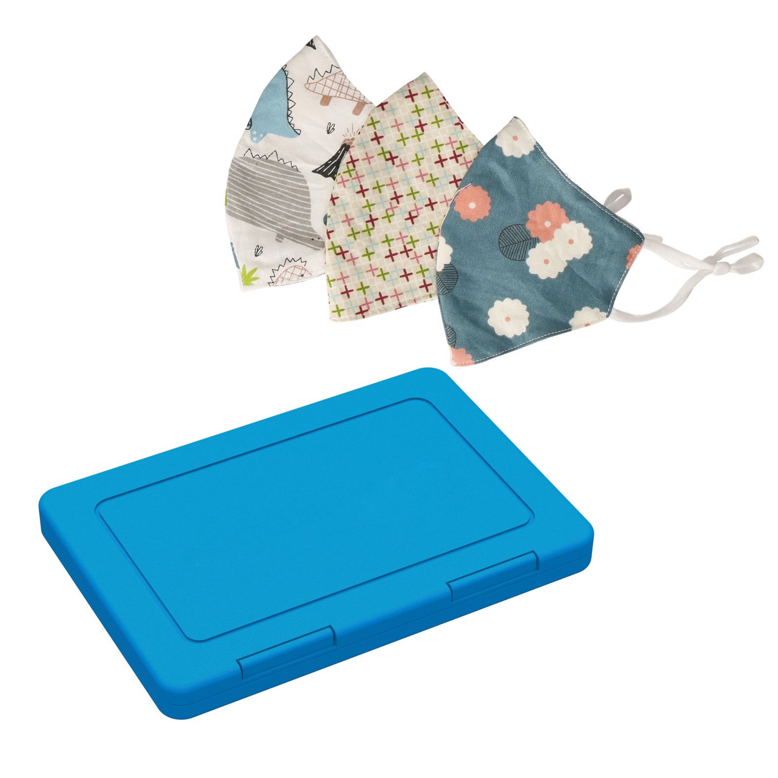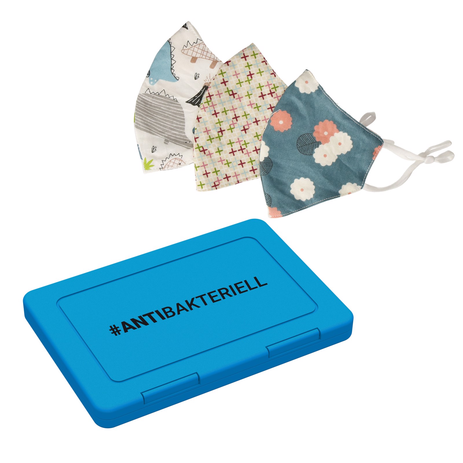 Boîte plate universelle peu encombrante avec 2 fermetures à clic pour ranger les masques de protection de vos enfants. Grâce à sa forme étroite, la boîte peut se faufiler dans n'importe quel sac. Grâce à ses composants spéciaux, le matériau protège contre la croissance de bactéries nocives à la surface. Cette mesure est efficace pendant toute la durée de vie du produit et n'a aucune influence sur sa recyclabilité. Y compris 3 masques communautaires enfants (art. n° : 01470) avec les motifs : 1x dino (blanc/bleu), 1x fleur (bleue), 1x croix (multicolore).