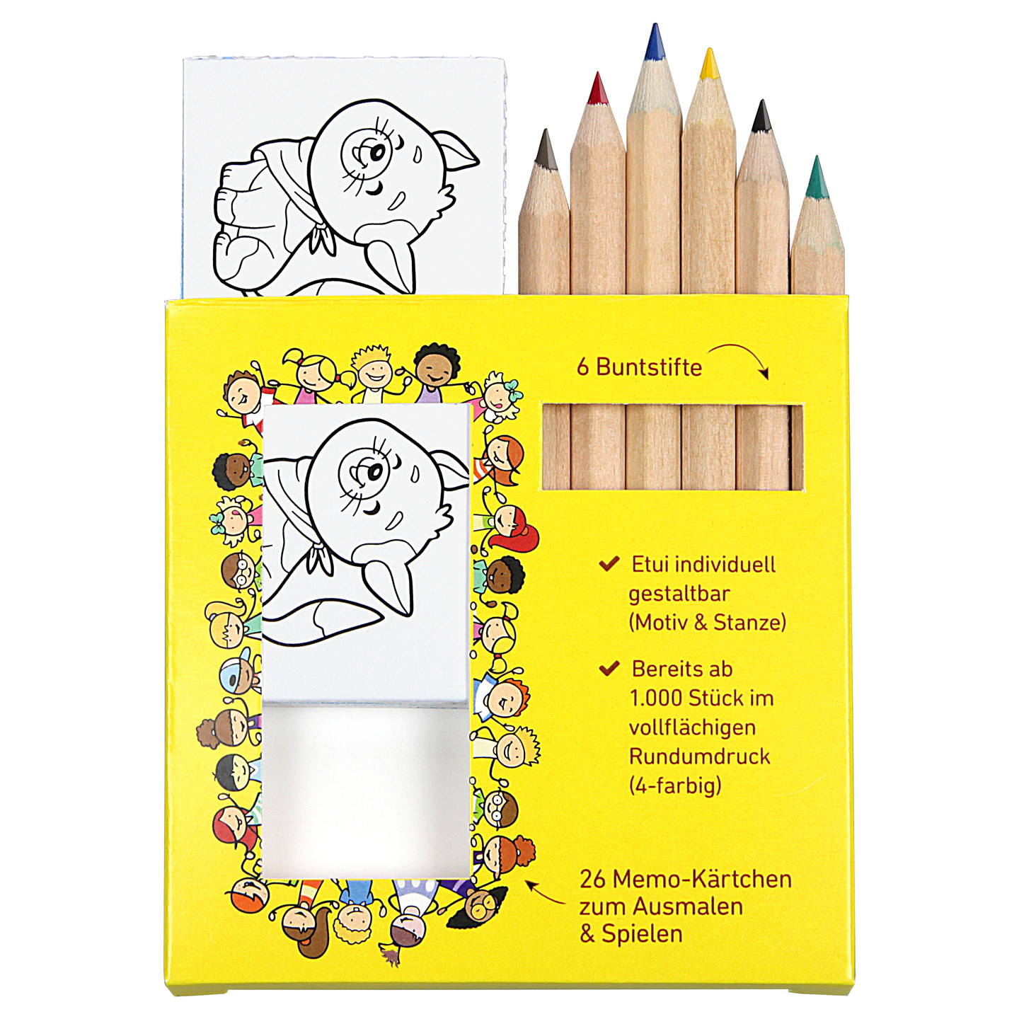 Set of 6 colored pencils-Memo, Etui inclusive allover allaround printing (4c), with 26 memo cards for coloring and playing, natural pencils, hexagonal, length 85 mm, measurements Etui ca. 90 x 90 x 8 mm, Etui 320g/m², european quality, accorind to the toy safety order DIN EN 71/III, TÜV certified, climate neutral