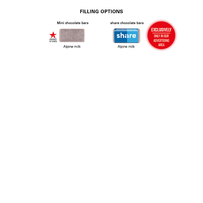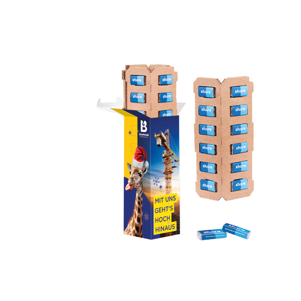 Advent calendar tower in solid cardboard cover with an inlay made of cardboard, all round with five advertising spaces, printed individually. Content: 24 share mini chocolate bars wrapped in glassine paper (can be disposed of in a normal waste paper bin) 72 g Seasonal article - while stocks last! Additional printing costs per order/motif flat rate: 109 €
