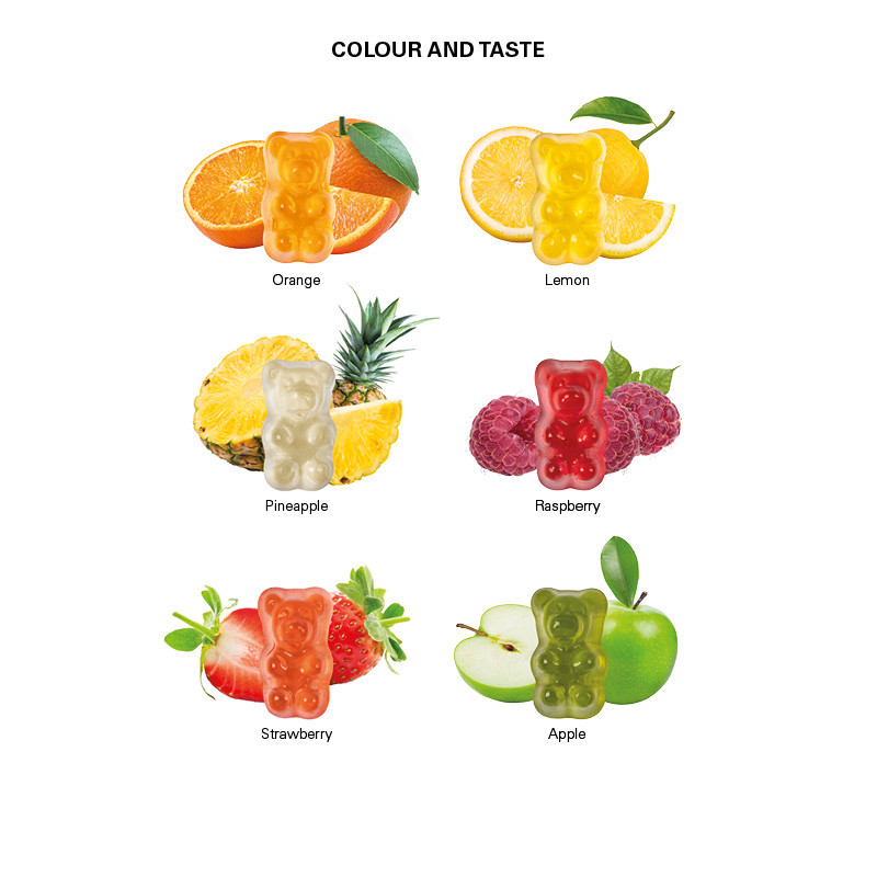 Fruit jelly bears in a bag made of transparent foil, individually printed. Content: Fruit jelly basic bears, colourful mixture, 7 g Additional printing costs per order/motif flat rate: 229 €