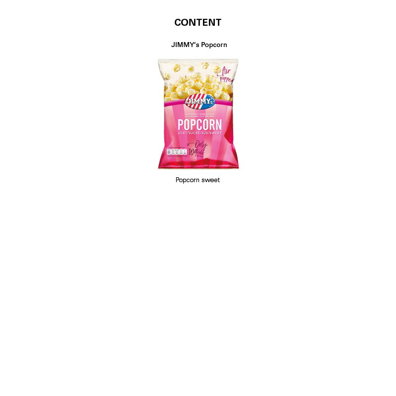 Folding box made of white cardboard, individually printed. Content: 1 JIMMY's Popcorn Sweet, 54 g.