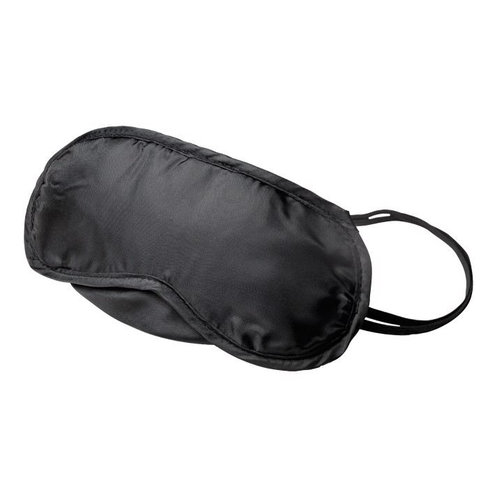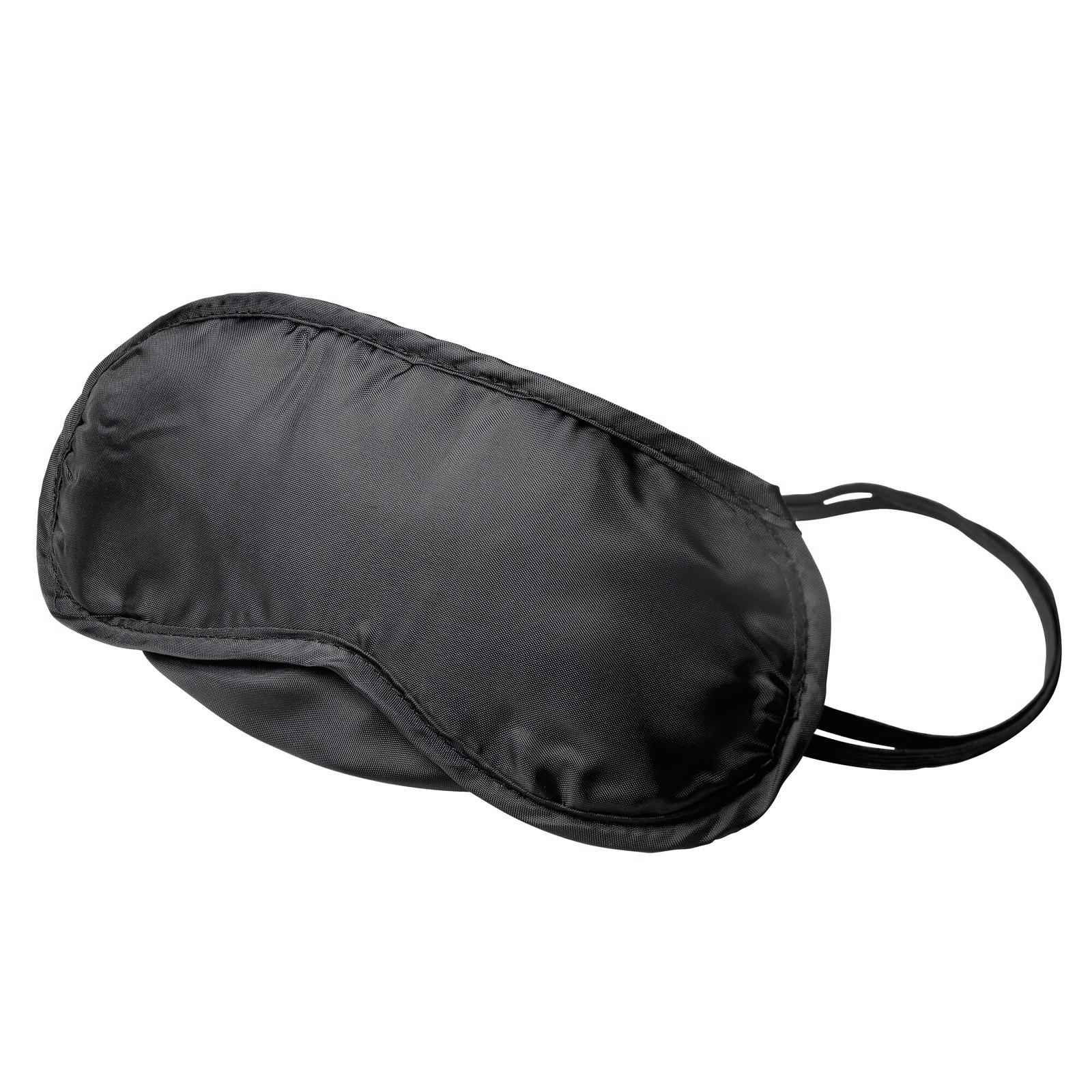 Masque pour les yeux en nylon noir avec double élastique en caoutchouc pour un bon serrage et un grand confort de port. En sérigraphie seulement en argent ou en or.