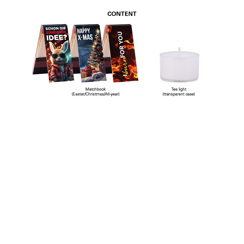 Small promotional box made of white cardboard, closure with popped-up circle, box individually printed. Content: 1 tea lights and 1 matchbook in a standard easter motif 20 g Seasonal article - while stocks last! Additional printing costs per order/motif flat rate: 109 €