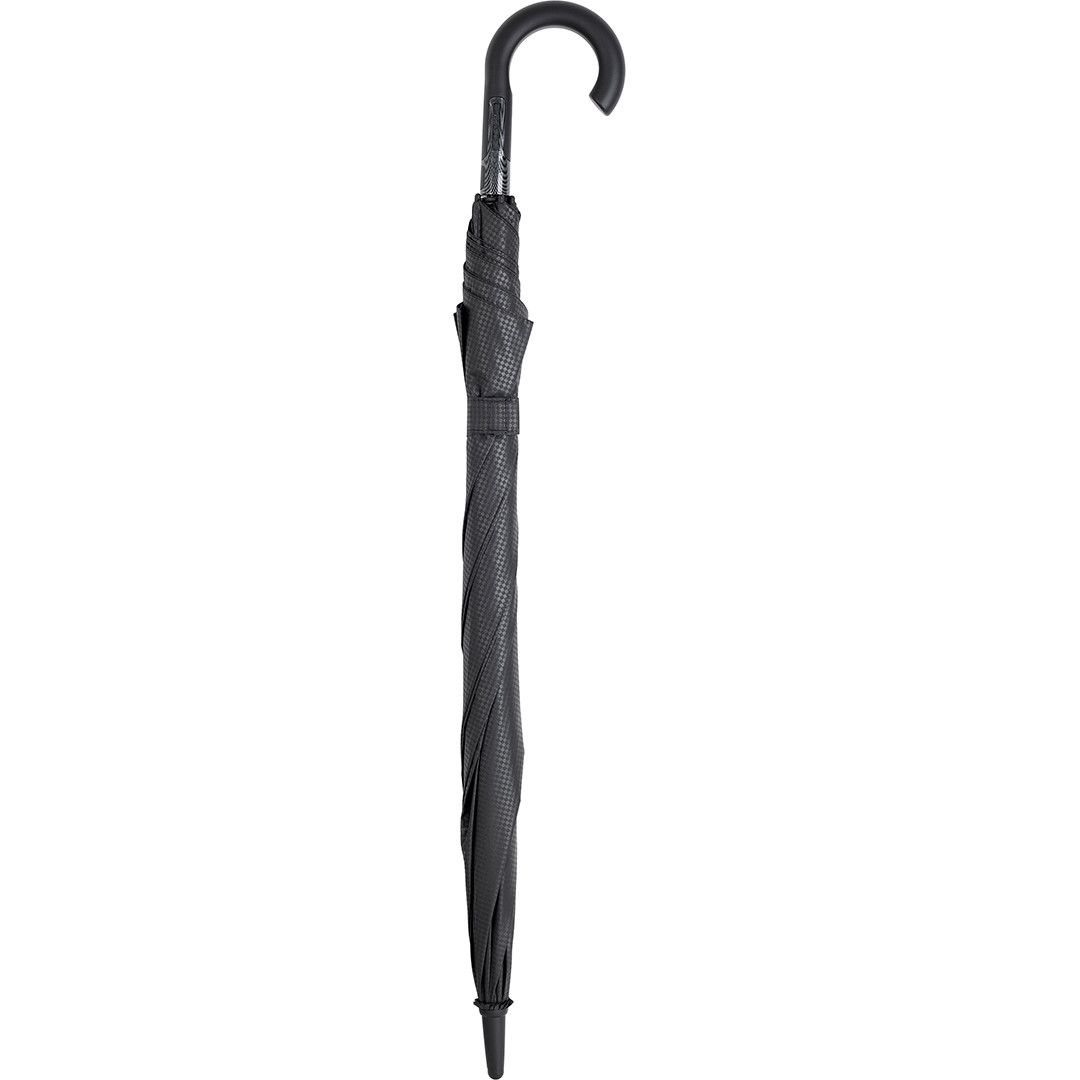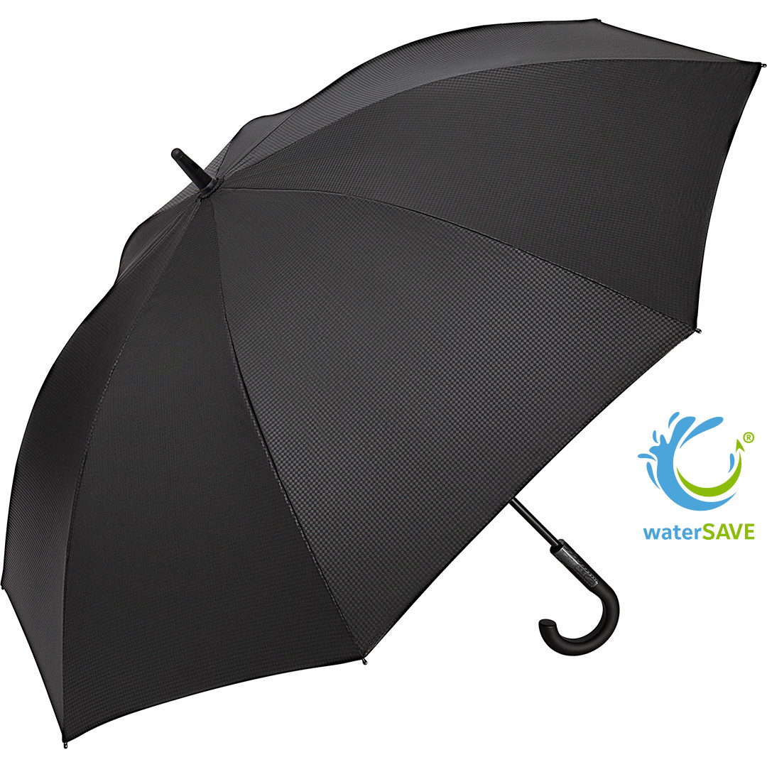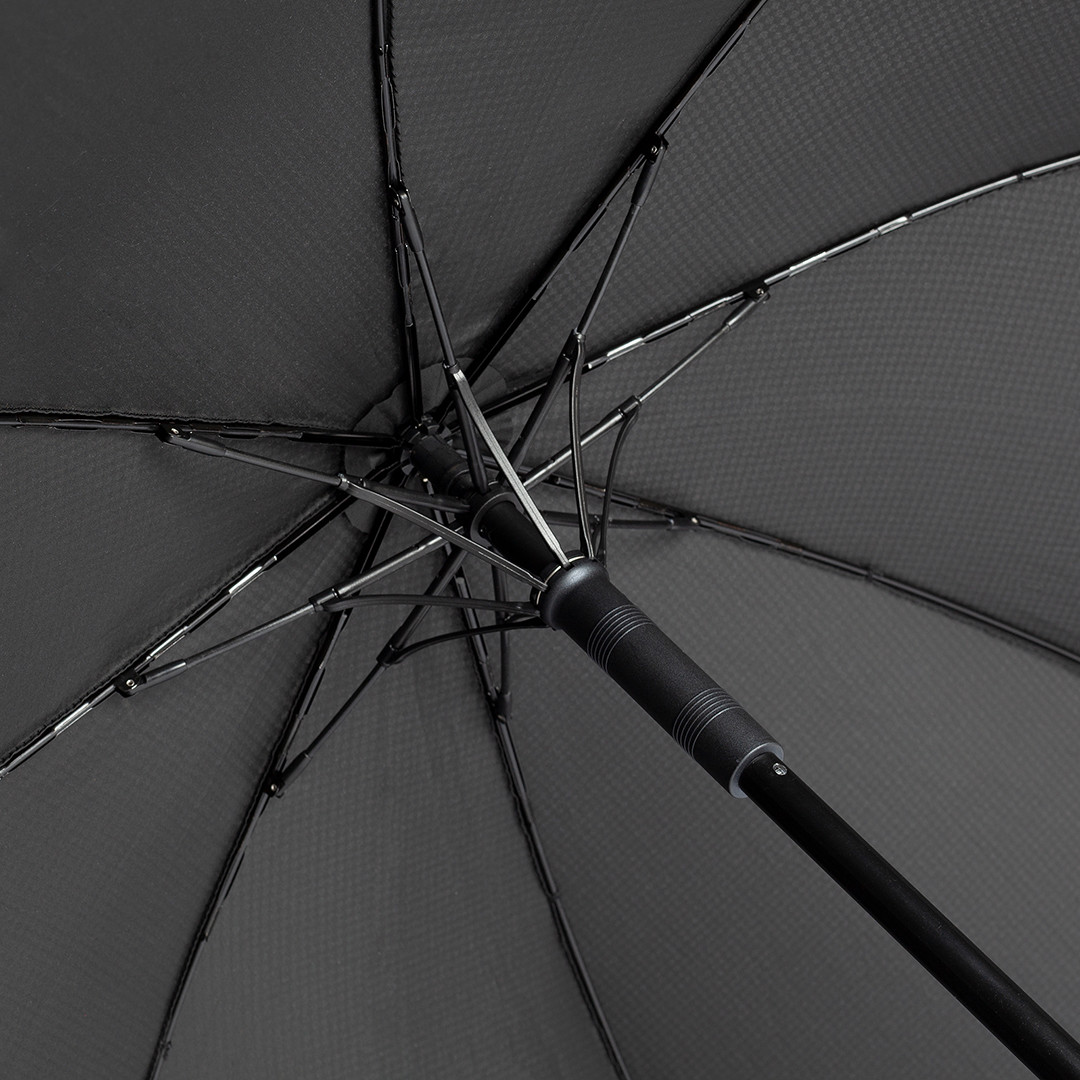 Fonction d’ouverture automatique confortable et rapide, système Windproof PLUS de haute qualité pour une flexibilité optimale face aux vents forts, baleines flexibles en fibre de verre, mât en acier avec mécanisme de fermeture raccourci pour une fermeture confortable, revêtement waterSAVE® en pongé et polyester écologiques fabriqué à partir de matières plastiques recyclées et teint avec peu d’eau, revêtement avec motif gaufré ton sur ton, poignée ronde Soft Touch avec détails en carbone, déclencheur et possibilité d’impression publicitaire
