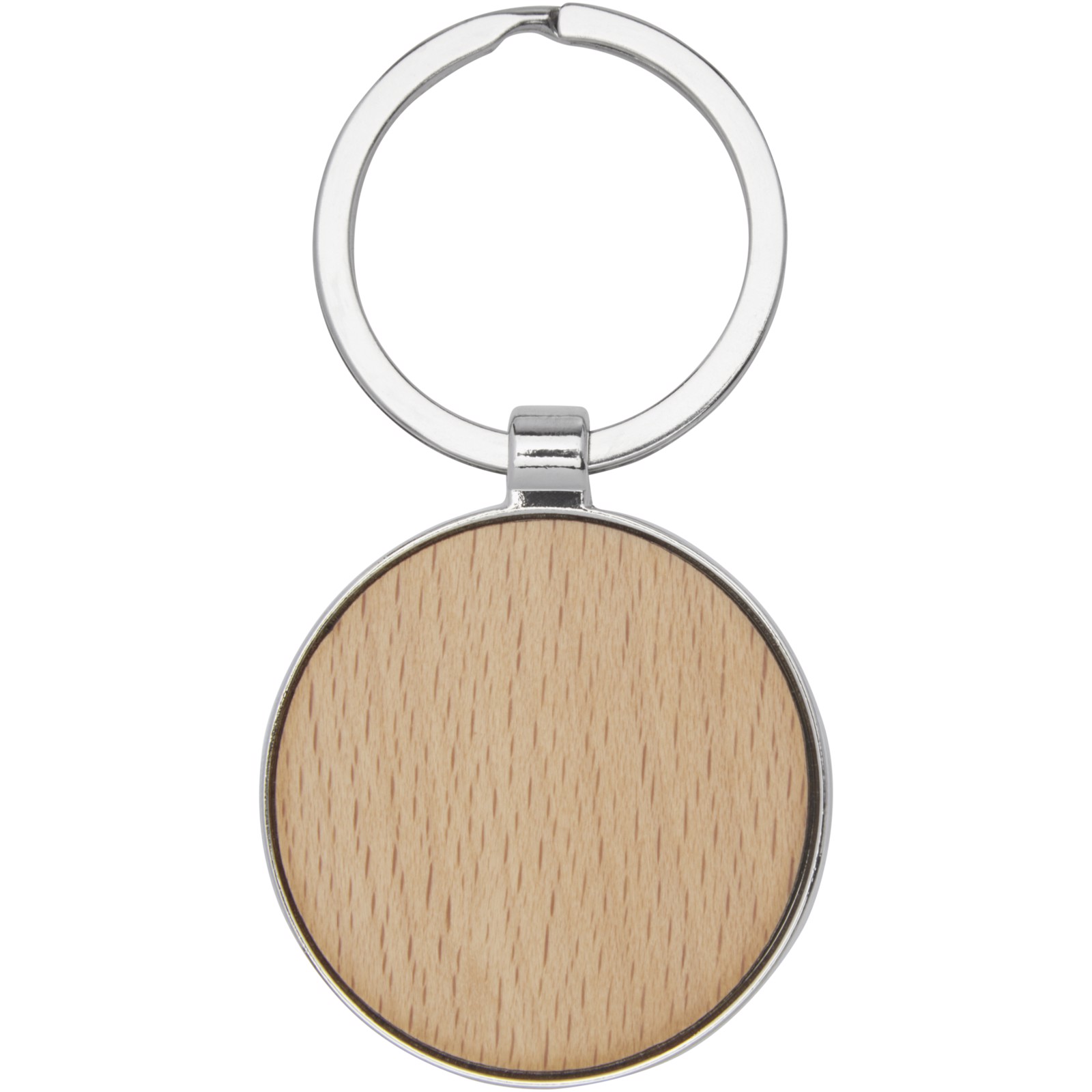 Porte-clés rond de qualité supérieure en bois de hêtre avec habillage métallique en alliage de zinc, livré dans une enveloppe en papier recyclé kraft brun. Le diamètre du porte-clés est de 4 cm. Peut être gravé.