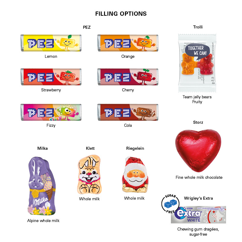 Fold-out promotion card in business card format, made of white cardboard with a practical tear-off perforation, individually printed. Content: 1 Confiserie Riegelein massive chocolate bunny made of premium milk chocolate The design of the Easter bunny can vary 5 g Seasonal article - while stocks last! Additional printing costs per order/motif flat rate: 109 €