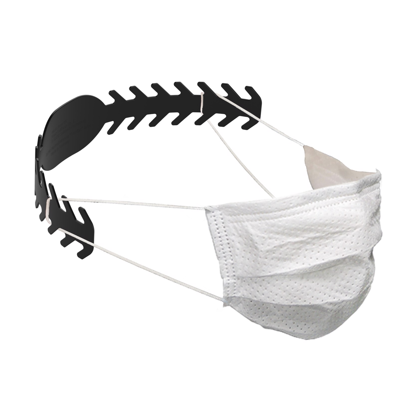 Vous éviterez les douleurs aux oreilles après une longue utilisation de votre masque. Le support permet de soulager les oreilles sensibles en déplaçant la charge à l'arrière de la tête. Il est compatible avec tous les masques de protection classiques. Grâce à ses nombreux crochets, votre masque s'ajoute parfaitement à votre tour de tête. Le support pour masque se nettoie avec un chiffon et du liquide vaisselle. Vous pouvez aussi le nettoyer avec un désinfectant. Il se réutilise ainsi à l'infini.