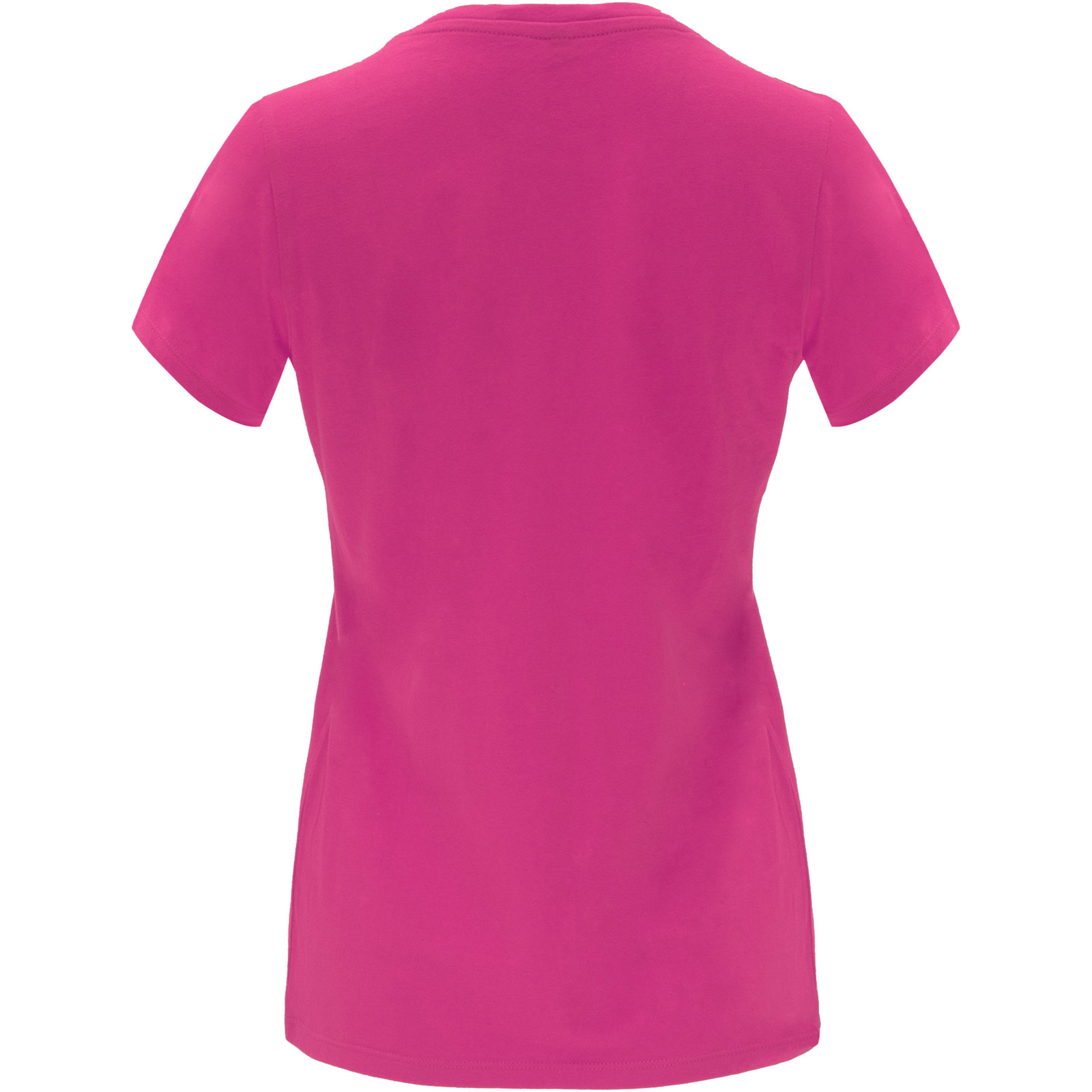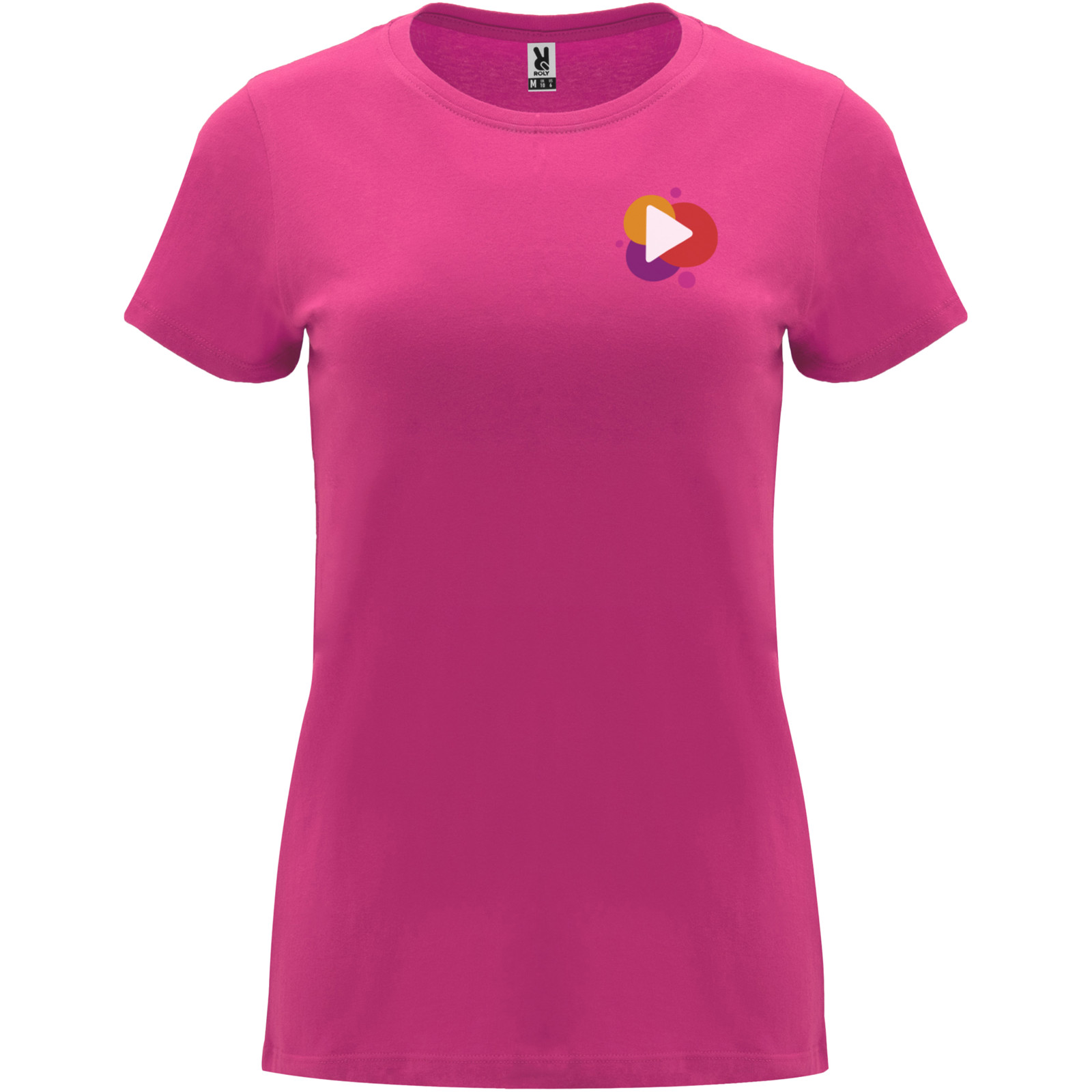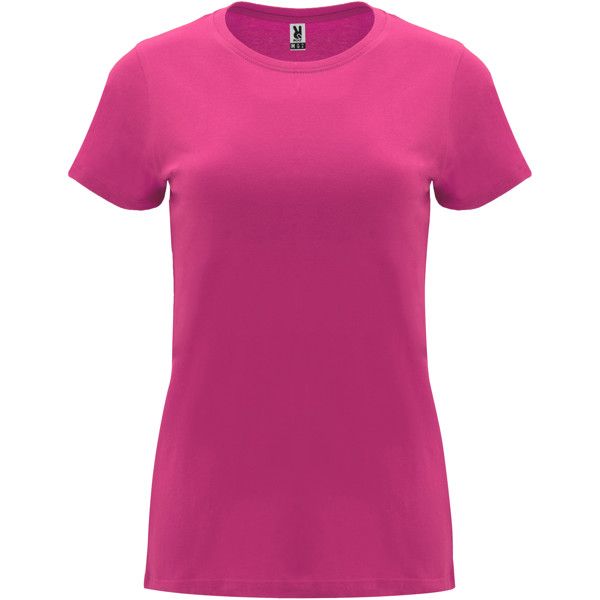 T-shirt ajusté à manches courtes pour femme. Col rond côtelé 1x1. Coutures recouvertes renforcées au col. Étiquette détachable.
