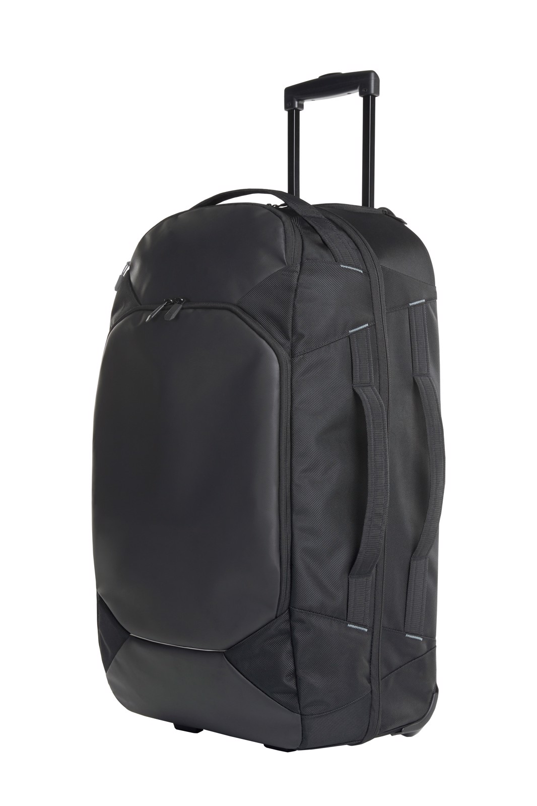 Sac de voyage à roulettes très élaboré avec bandes réfléchissantes; compartiment principal avec fermeture Éclair à deux sens et circulaire sur trois côtés; compartiment principal sur le dessus avec cloison à fermeture Éclair; compartiment principal sur le dessous avec sangle élastique; petites poches avant avec fermeture Éclair et tirette zip de couleur; grande poche avant avec fermeture Éclair à double sens, rangement plat et rembourré, deux petits rangements, grand compartiment en filet à fermeture Éclair et passants élastiques; poignées rembourrées; fond renforcé; piètement; poignée télescopique; roulettes à roulement souple