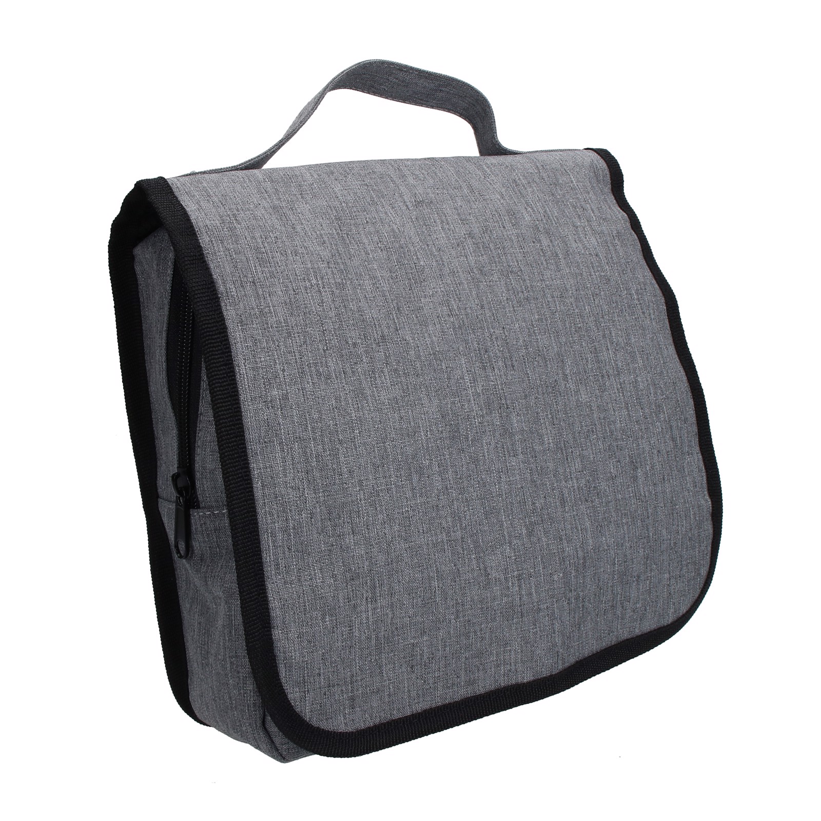 Trousse de toilette de haute qualité en gris chiné chic. Le sac comporte une solide poignée de transport, un crochet en plastique, un grand compartiment principal avec fenêtre en filet pour tous les ustensiles importants et deux autres compartiments en filet avec fermeture éclair dans la partie supérieure, ce qui est idéal pour les petits objets. La trousse de toilette est fermée par deux fermetures autoagrippantes. Volume de remplissage : env. 3,0 litres.